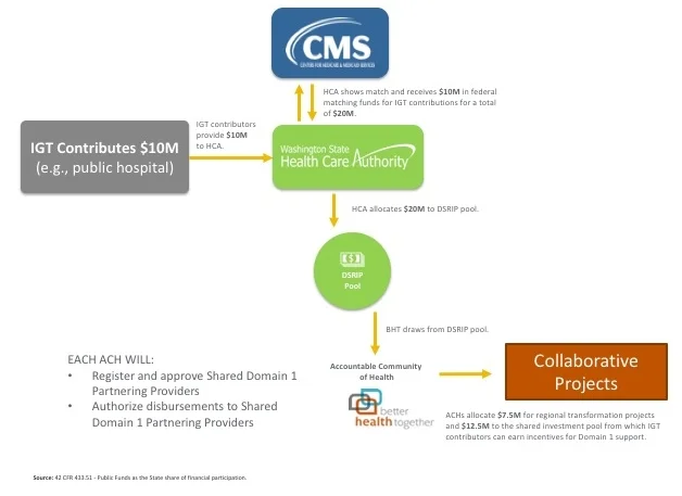 University of Washington (in association with UW Medicine) and the Association of Washington Public Hospital Districts (initially Evergreen Medical Center and Valley Medical Center) have offered to participate as IGT contributors. Other public hospitals or government entities with the ability and interest to contribute are certainly welcome. It should be noted that IGT funding supports the DSRIP program across ACHs. BHT is committed to exploring expanding the list of IGT contributors to include potential partners in the Eastern Washington.