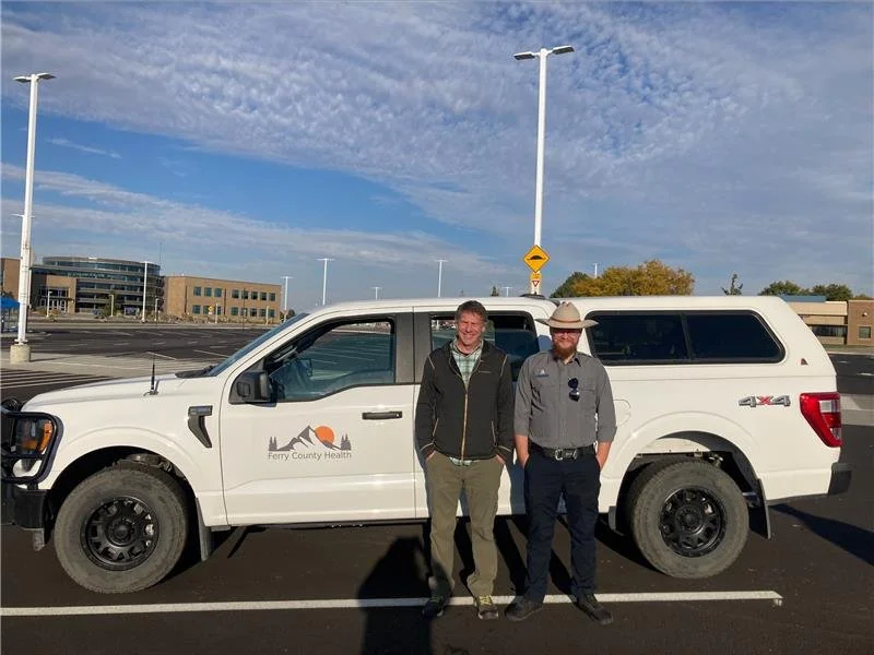 Ferry County Health staff Greg and Colton stand with the new truck they’re using to provide Mobile Integrated Health (MIH) services to patients, including direct health care and navigation support. To support this model, the MIH team – who all have medical training – are taking community health worker training too!