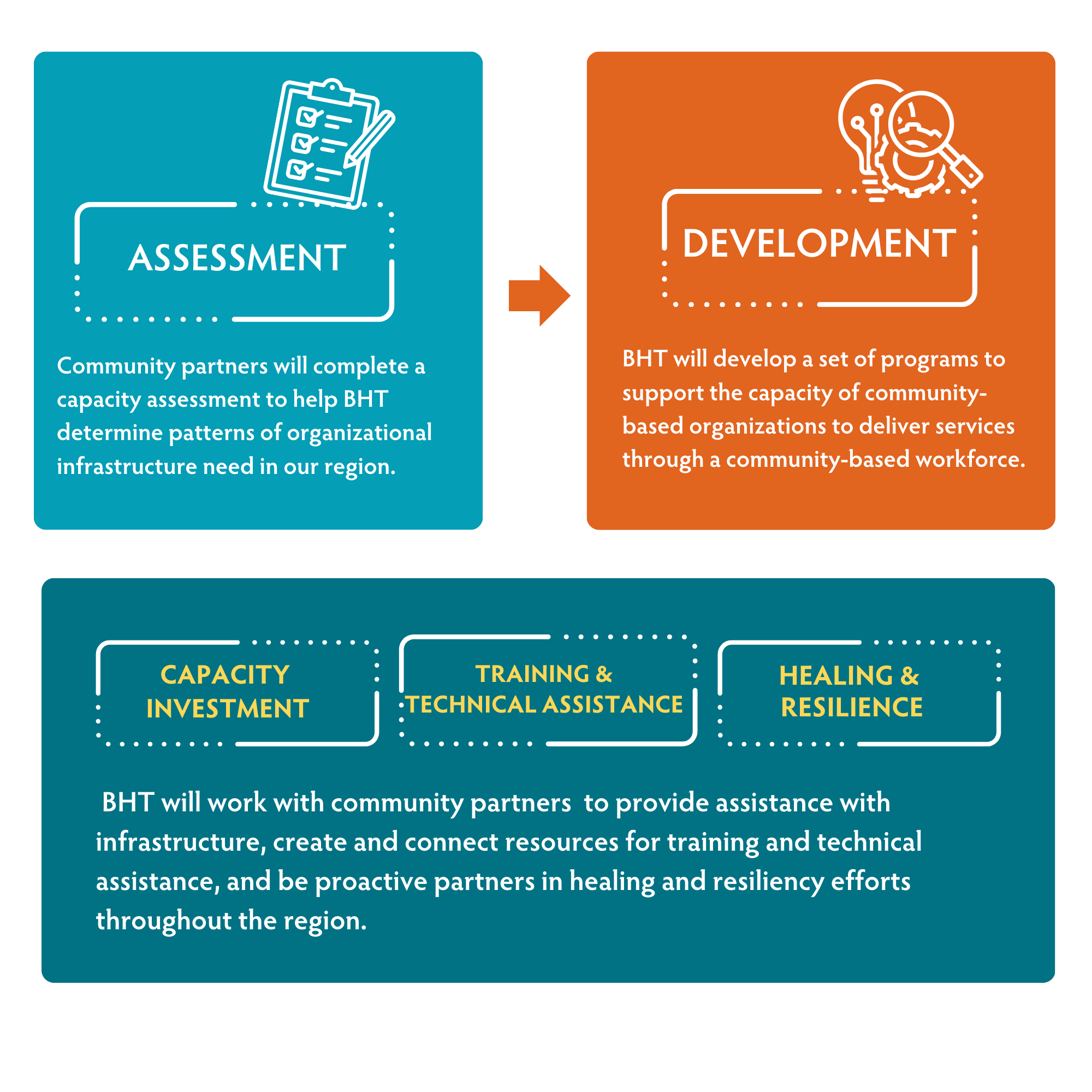 BHT is currently conducting informal organizational assessments so we can find patterns in community organization capacity and how we can leverage funding to fill gaps. Partner input is essential for informing BHT’s Community of Learning initiative, and these assessments are a first step in understanding regional needs and opportunities as we leverage community expertise and Medicaid Waiver dollars to enhance our social care network.
